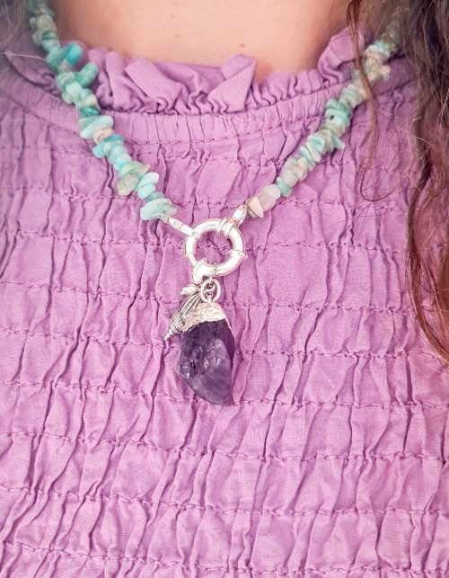 Collar Haathee cuentas amatista, elefante plata y aguamarina natural