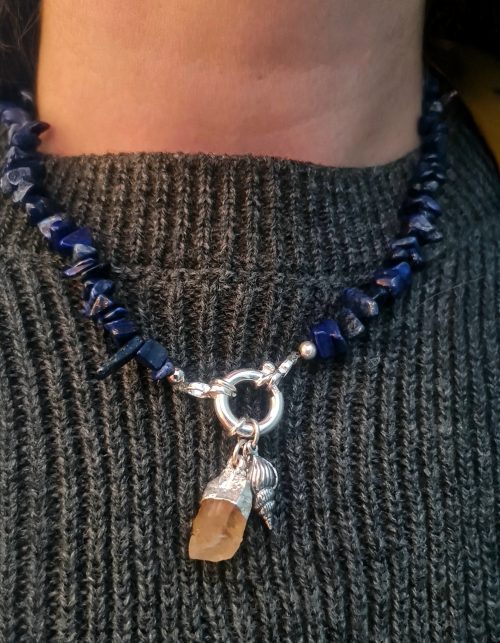 Collar Bhompoo cuentas apatita azul, colgante cola de ballena plata